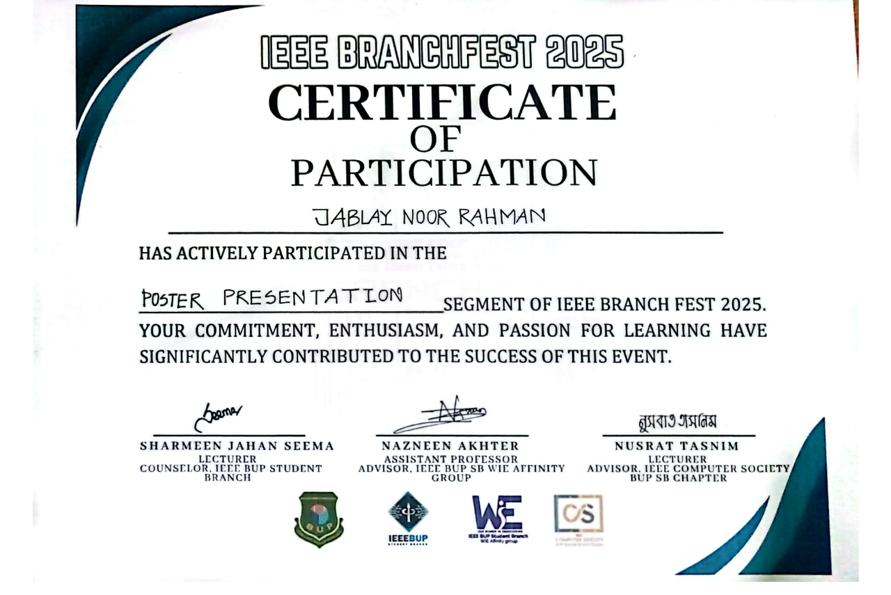 Awarded Certificate of Achievement for placing 3rd in the IEEE Branchfest 2025, poster presentation showcasing commitment to professional development and technical excellence.